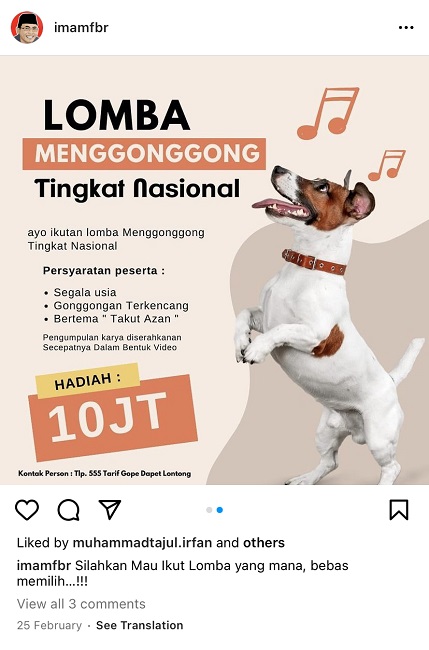 A stern-looking portrait of Luthfi Hakim, the FBR’s leader and self-styled Imam Besar (Great Leader), accompanied his message. He is wearing dark sunglasses, a peci and has his arms are folded across his t-shirt, which depicts a growling tiger. His Instagram post reads: