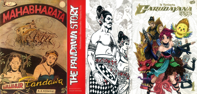 From left to right: the 1956 Mahabharata by R.A. Kosasih; originally published in 1984, Teguh Santosa’s The Pandawa Story was republished in 2013 in this English language edition; the manga styled Garudayana Saga of Is Yuniarto (2013).
